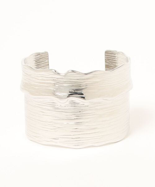 表面を掻いたような加工を施した変形バングルは、何度も試行錯誤を重ねたアイテム。デザイン性が高く高級感もあり、コーディネートに取り入れるだけでぐっとこなれた印象になる存在感です。