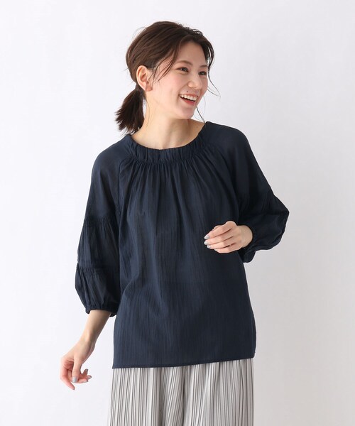 【デザイン】 やわらかい綿シフォンの素材が特徴的なブラウス。 今年トレンドの袖ボリュームデザインがポイントです。 パンツやスカートなどどんなアイテムにもあわせやすいシルエットに仕上げているのも◎ 【生地感】 シャリ感のある素材なので夏の暑い時期に重宝できる1枚です。 ※こちらの商品はやや透け感があるため、インナーの着用をおすすめします。 【サイズ】 大きいサイズ(LL)の展開あり。 ※04(LL)サイズはWEB限定サイズです。 こちらの商品は主に秋に着用いただける商品です。 モデル情報:身長167cm B78 W62 H88 着用サイズ:02(M) 店舗へのお問い合わせ商品番号:C62-83500 ●製品寸法: 02(M):着丈63cm B116cm 裄丈61cm 03(L):着丈64cm B122cm 裄丈62cm 04(LL):着丈65cm B128cm 裄丈63cm 備考: