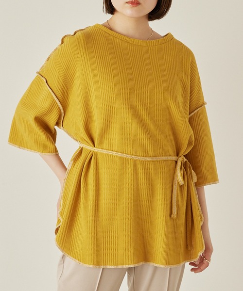 目を惹く配色ステッチが定番と差をつけるワッフルカットソー ■デザイン 肉厚なワッフル生地が、カジュアルながらもぐっと高見え効果を生むデイリーに使える万能トップス。 サイドに深く入ったスリットがさりげない抜け感をプラスし、付属のひもでウエストをブラウジングすればメリハリのあるスタイルアップシルエットに◎ お尻が隠れるやや長めの丈感や、ゆったりとした袖口など、さりげなく体型カバーが叶うのも嬉しいポイント。 袖やバックスタイル、ヘムラインに施された配色ステッチのデザインが一味違う変化のあるトップスです。 ■スタイリング コーデの邪魔にならないシンプルなデザインなので、どんなボトムスを合わせてもサマになるトップスですが、 軽やかでフェミニンなプリーツパンツやテロっとした落ち感のあるボトムスを合わせればバランスの良い女性らしいカジュアルコーデが完成◎ カラーパンツを組み合わせてサイドのスリットからちらっと見せるスタイリングもおすすめです。 ■POINT ・お尻が隠れる丈感でナチュラルに体型カバーができる ・シンプルながらも目を惹く配色ステッチデザイン ・肌触りのいいワッフル生地 《mikke-ミッケ》Produced by mer 雑誌が身近になったオシャレのお手本帖、女性向けファッションメディア『mer』がプロデュースするブランドです。 ※屋外での撮影画像は、光の当たり具合で色味が違って見える場合がございます。また、ご覧になっているデバイスやモニター環境によって、実際の色味と多少異なって見える場合がございますので予めご了承をお願い致します。