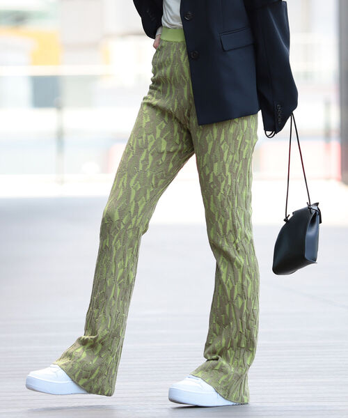 リラクシーに穿ける最旬パンツ <Ray BEAMS(レイビームス)>オリジナルのジオメトリック柄が目をひくニットパンツ。ドライタッチな糸と伸縮性のある糸を編み上げることで、さらっとしつつも肌触りの良い風合いに仕上げました。高めの位置からのフレアシルエットに加え、縦に流れるような柄が足長に見せてくれるのも嬉しいポイント◎。 同柄のベスト(品番:61-05-0191-370)とのセットアップはもちろん、シンプルにTシャツと合わせてもトレンドライクに着こなせるひと品です。 BLACK STAFF Model : H162 (cm)(画像の商品はサンプル用サイズのため実際のサイズ感と異なります) GREEN Model : H166 (cm)(画像の商品はサンプル用サイズのため実際のサイズ感と異なります) ※屋外撮影による光の当たり具合やパソコンなどの閲覧環境によって、実際の色味と異なって見える場合がございます。予めご了承ください。 ※商品の色味は商品単体で撮影した画像をご参照ください。