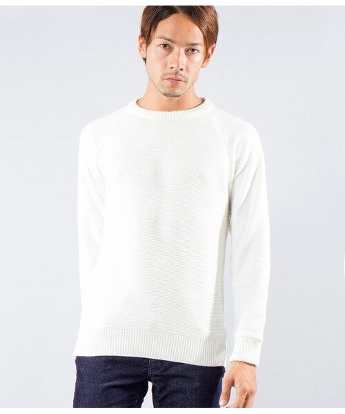 袖裏毛切替クルーネックニット。ジュンレッド。【素材感で定番アイテムに新鮮味を】スウェットとニットを融合したオリジナリティのあるデザイン。ラグラン袖のパーツの生地を裏毛カット地を使用しています。それにより、着用した時の軽さと肌触りの柔らかさが特徴です。model:178cmsize:1