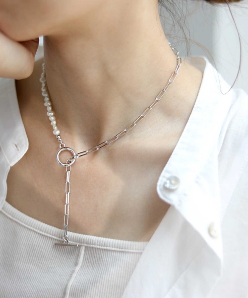 マルチWAYで使える!旬のマンテルモチーフに柔らかな雰囲気で女性らしさをランクアップ。淡水パールチェーンネックレスの登場です。トレンドのマンテルが存在感抜群のネックレス。チェーン部分にふんだんに使用した淡水パールは、天然素材ゆえ、一粒ごとにイロ・カタチが違っていて、ニュアンスたっぷり。引き輪金具の位置を変えて、短めのY字のシルエットにしたり、マンテルを背中側に回して、すっきりしたデザインに表情を変えても◎[アレルギー対応のニッケルフリー]金属アレルギーの原因のトップとされるのがニッケル。だけど加工がしやすいから多くのアクセサリーに使用されています。ニッケルフリーとはニッケルという金属などで引き起こるアレルギーを「防ぐことを目的」にニッケルをほぼ含まずにニッケルフリーメッキを使用しているもの。ニッケルによる金属アレルギーをお持ちの方でも安心してお使い頂きやすくなっています!※こちらのアクセサリーはアレルギーを起こしにくい素材を一部使用しておりますがアレルギー反応に関しましては個人差がございますので全ての方に適合するものではございません。※ニッケルフリー素材は性質上変色する場合がございます。変色による返品・交換は受付かねます為予めご了承の上お買い求めくださいませ。※天然素材の為、一つ一つの色の違いやかけているのも、自然にできたくぼみ、縞などが見られます。色の薄いもの、濃いもの、大きさに違いがございますのでご了承の上お買い求めくださいませ。