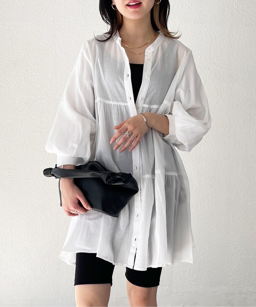 《detail》 ・トレンドのティアードデザインと、ふんわりとしたボリューム袖が華やかさをアップさせる一枚です。 ・デニムやワイドパンツなど定番ボトムスとの相性は抜群。 テーパードパンツや細身のボトムスと合わせれば、シルエットにメリハリを持たせてくれます。 ・首元はバンドカラーですっきり感と上品さをプラス。 ゆったりとしたシルエットにすることで少しヌケ感が出るようにしています。 ・ボタンを開け、タンクトップなどのインナーを覗かせれば、首回りを涼しげに見せる夏らしい着こなしに。 ・前を開ければ羽織としても大活躍。 《fabric》 ふわッとした着心地のよい素材。 ほんのりとした透け感がナチュラルな印象です。 ・透け感:有り ・裏地:無し ・伸縮性:無し ・生地の厚さ:薄手 ◆商品のお気に入り登録 完売カラーの再入荷通知、残り1点の通知、セール等値下げした時の通知も受け取ることができます。 ◆ブランドのお気に入り登録 新商品や再入荷など、いち早くブランドのお得な情報を受け取ることができます。 是非ご活用ください。 ※この商品は、摩擦や、汗・雨などによる水ぬれにより色落ちが生じる場合がございます。 衣服や周囲のものに色移りする恐れがありますので、白色や淡色のものと組み合わせる際は、十分にご注意ください。 ※撮影環境により多少実際のカラーと異なる場合がございます。 ※生産時期により若干の色ブレやサイズの変動が生じる場合がございます。 ※表示のサイズ感と実物は異なる場合もございます。 上記ご了承の上、お買い求め下さいませ。