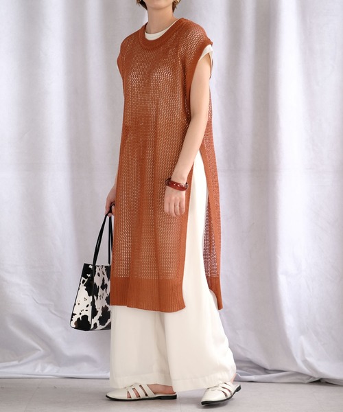 深めのスリットでスタイルアップも。シャリ感のあるナチュラルな風合いなニットロングベスト。カラーボトムや柄ボトムと相性の良いミディ丈でレイヤードを最大限楽しめます。二の腕をカバーしてくれる人気のフレンチスリーブと脚を長く見せてくれる深めのスリットはこだわりのディテール。透かし編みで抜け感のあるニットベストは1枚あると重宝するアイテムです。ベージュ系その他=エクリュベージュ■コーディネートアイテムアウター…tj76c04940パンツ…bs76c04937パンツ…bf09x04576バッグ…gz76q04772■商品仕様シャリ感のあるニット生地裏地…なし伸縮性…あり透け…編み目からの透けありポケット…なし付属品…なし着脱…プルオーバー※ニット製品(特に化繊使用のもの)やプリントのある製品には、お届け直後の臭いが強く感じられる場合もございますがお洗濯して頂いたり、陰干しをして頂いたりすることで、改善できると思います。気になる方はご遠慮ください。※透けますのでインナーの着用を推奨します。※サイト上のカラー名と、お届け商品に記載されているカラー名が異なる場合がございます。【ご購入前に必ずご一読下さい】※モニタ環境によって、商品の色合いが多少異なる場合がございます。※色落ちの恐れがありますので、他のものと分けてお洗濯して下さい。※商品をお安く提供させて頂く為、検品後のアイロン掛けは省略させて頂いています。発送時も簡易梱包の為、お受け取り時にたたみ皺があると思いますがご了承下さい。