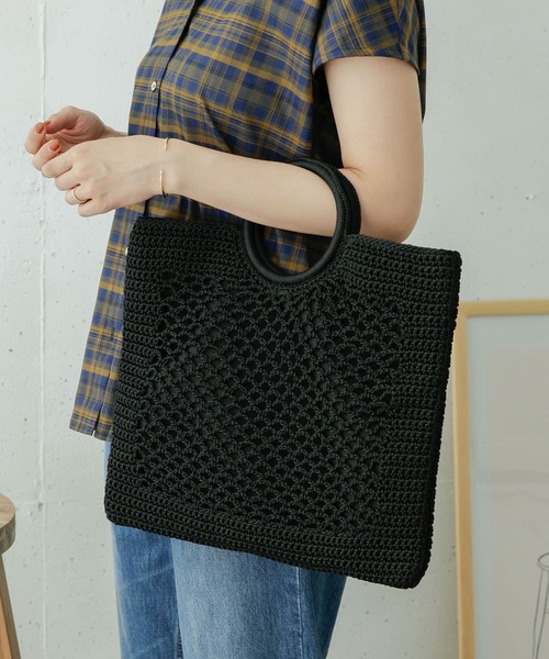 特徴的なハンドルや編地が可愛く、程良い抜け感を演出してくれるクロッシェバッグ。 書類なども入る丁度良いサイズ感で、普段使いはもちろんカジュアルなお仕事用バッグとしてもオススメです。 ※この素材は、摩擦や汗・雨に濡れた状態での使用により、他の衣料等に色が移る場合がございますので、充分にご注意ください。 ※A4サイズ収納可能 総重量 : 約450g ※商品画像は、光の当たり具合やパソコンなどの閲覧環境により、実際の色味と異なって見える場合がございます。予めご了承ください。 ※商品の色味の目安は、商品単体の画像をご参照ください。