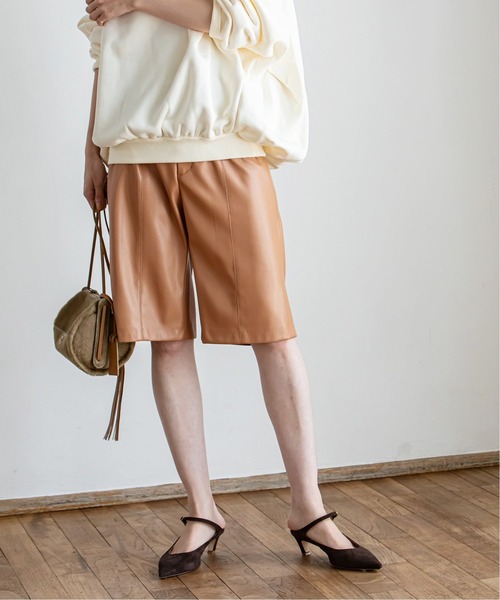 【2021AW】 NOBLE スタイリングに鮮度をプラスするフェイクレザーを使用したハーフパンツ。 しなやかな質感と、もちっとした弾力性が特徴の一枚。 広がりを抑えた細身シルエットでハンサムな印象に導きます。 艶感が美しく上品な光沢の素材感で、ニットやシャツとのスタイリングにメリハリを付けてくれるアイテムです。 ********************** 透け感:なし 裏地:あり 伸縮性:あり 光沢感:あり 生地の厚さ:普通 ********************** 【スタッフ着用コメント】 《スタッフA》 年齢30代/身長:161cm/体型:普通/普段サイズ:S/着用サイズ:38 サイズ感:いつもサイズでジャストで着るのも素敵ですが、ワンサイズ上げてゆったり着こなすのもキレイです 素材感:柔らかいフェイクレザー。光沢があり薄手ではないので上品な印象。 着心地:身体に馴染み、程よく伸縮性があるので着やすい ********************** ※取り扱いについては、商品についている品質表示でご確認ください。 ※こちらの商品は、NOBLEでの取り扱いになります。 直接店舗へお問い合わせの際はNOBLE店舗へお願い致します。 ※照明の関係により、実際よりも色味が違って見える場合があります。 またパソコン・スマートフォンなどの環境により、若干製品と画像のカラーが異なる場合もございます。予めご了承ください。 洗濯:ドライクリーニング