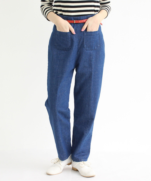 懐かしさのある色でレトロな雰囲気に作ったボトムシリーズ。よこにネップ糸を使った表情感のあるデニムです。生地が柔らかくなるよう打ち込み本数を少なく設定した生地に洗いをかけ、着心地の良さを追求しました。-------------------------------------------------ウエスト周りはすっきりと、裾に向かってなだらかに細くなるテーパード型。ハイウエストとセンタープレスのディテールが、程よく体型をカバーしてくれます。バックスタイルの小さな切れ込みもポイントです。スタイリングに合わせて細かな丈の調整が出来るよう、ベルトループをつけました。2サイズで展開しております。【ピタッと履きたい方】ジャストサイズか、小さ目がおすすめです。ストレッチ性は無いですが柔らかいデニムなので、ご自身のサイズと大きな差が無ければぴったり目を選んでも履いて頂けそうです。【迷っている方】&【色々な履き方をしたい方】36.38どちらも自分に合うサイズだから迷っている…という方は、ベルトを使うとある程度の調整が可能なので、38サイズがおすすめです。普段パンツがゆるくなりがちな方も、ゆとりがあるのを活かしてベルトでギュッと締めて履いても可愛いです!大き目のスカーフや安定感のある太めのベルトでしっかりウエストマークして、スタイリングのポイントにして下さい◎