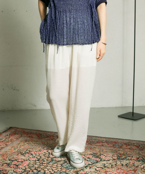 【スタイリングに軽やかさを与える楊柳イージータックパンツ】スタイリングに軽やかさを与える、楊柳素材で仕上げたイージーパンツ。とても柔らかい穿き心地で暑い時期でも快適に過ごせます。程良い透け感がさらに涼しげな印象にしてくれて◎夏らしいカラー展開にも注目してみて。POINT・穿き心地の良い楊柳素材・涼しげな印象の透け感&裏地付き・夏らしいカラーリングCOORDINATEオーバーサイズのトップスや、ワンピースと合わせれば旬なスタイリングが完成。Tシャツやタンクトップでさらっと合わせても◎※この商品は、デザイン上、モノフィラメント糸を使用しています。糸の特性上、ザラザラした肌触りがあり、肌に触れますと赤くなる場合があります。特に肌が弱い方や汗をかきますと顕著になります。直接肌には着用せず、下に1枚着用することをおすすめします。※その他お取り扱いに関しましては、商品に付属のアテンションタグをご覧ください。※商品画像は、光の当たり具合やパソコンなどの閲覧環境により、実際の色味と異なって見える場合がございます。予めご了承ください。※商品の色味の目安は、商品単体の画像をご参照ください。-----------------------------透け感 : ややあり(OFFのみ)伸縮性 : ややあり裏地 : あり(股上まで)光沢 : なしポケット : あり-----------------------------▼お気に入り登録のおすすめ▼お気に入り登録商品は、マイページにて現在の価格情報や在庫状況の確認が可能です。お買い物リストの管理に是非ご利用下さい。