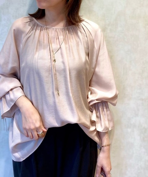 透け感が上品で女性らしいドレープシフォンフリルカフスブラウス ●デザイン ドレープ性のある素材の特徴を生かしたフリルカフスブラウス。 透明感のある上品な光沢の素材を使用した、甘さを抑えたエレガントで女性らしい一枚。 カフスはスリットと共地テープ使いで抜け感のある仕上がりに。 後ろ襟ぐりはギャザーなしのシンプルなデザインで、肩から背中にかけてすっきりした見た目で着用いただけます。 ●おすすめコーディネート ニットやスウェットの袖口からフリルを覗かせるレイヤードスタイルがおススメ。 着るだけで女性らしいアイテムなので、あえてマニッシュめなパンツやデニムではずすのも◎ ●素材 レーヨン64% ポリエステル36% ・薄く肌触りがとても良い ・シワになりにい 洗濯方法:手洗い 透け感:あり 裏地:なし 伸縮性:なし 生地の厚さ:薄手 光沢:ややあり 【スタッフ着用コメント】 《SAYAKA》 身長:159cm/普通/普段サイズ:S/着用サイズ:F サイズ感:程よくゆとりのあるサイズ感。落ち感があるのですっきりとしたシルエットで着ていただけます。 素材感:薄手ですがシワになりずらい素材です。 着心地:軽くさらっとした着心地。一枚で女性らしく着れるアイテムです。 ============================== 【注意点】 ※画像の商品は光の照射や角度、お使いのモニター環境により、 実物と色味が異なる場合がございます。 あらかじめご了承下さいませ。 ============================== 【お買い物をもっと便利に楽しく♪】 『♡』をクリックでお気に入り登録 ・「商品のお気に入り登録」で・・・ ラスト1点や再入荷の通知が届きます。 登録して頂いた商品だけが対象となる、あなただけのタイムセールが開催されることも! ・「ブランドのお気に入り登録」で・・・ 新商品や再入荷など、いち早くブランドのお得な情報を受け取ることができますので、ご登録をおすすめします! ==============================
