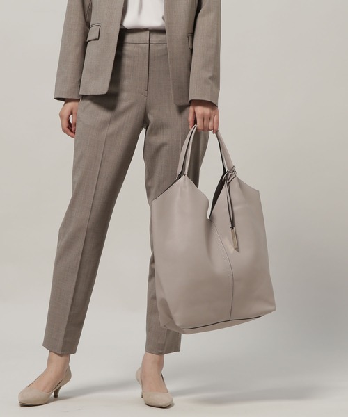 ナローなシルエットがリラクシーな雰囲気の大容量トートバッグ。縦長シルエットだからダ大荷物でも小脇にすっきり収まり、長めに設定したショルダーでコートを着たときなどももたつきません。スエード調のライニングがリュックスな1枚仕立て。マチの口元を折ったり出したりすることで、違った雰囲気を楽しむことも出来ます。※モデルの着用画像の場合、光の当たり具合により、実際の色味と異なって見えることがございます。色味は、商品単体の画像をご参照ください。