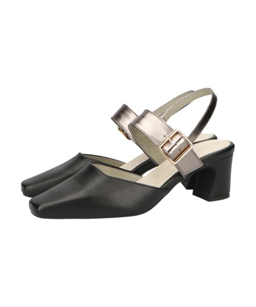 太めのベルトデザインが足元にメリハリをつけてくれるミュールパンプス。履き口のスクエアカットやフレアヒール、素材使いなどディテールにこだわりモードな印象に。バックストラップは細めにして程よい抜け感を演出。同系色のバイカラーなのでコーディネートに馴染みやすい。