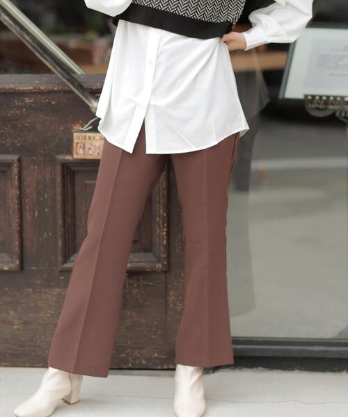 2021 秋アイテム きちんと感のあるセンタープレスパンツはキレイカラーでオンオフ問わずに大活躍。 伸縮性のある生地で仕立てているので動きやすく快適な穿き心地になっています。 裾へ向かってほんのり広がるセミフレアシルエットで美脚効果も抜群。 バックウエストはゴムになっているのでフィット感良く着られます。 サイドには便利なポケット付き。 ・バックウエストゴム ・ポケットあり 【以下グリーン参考。カラーにより多少の誤差あり】 ・透け感:透けない ・伸縮性:あり ・生地の厚さ:薄い ・裏地:なし
