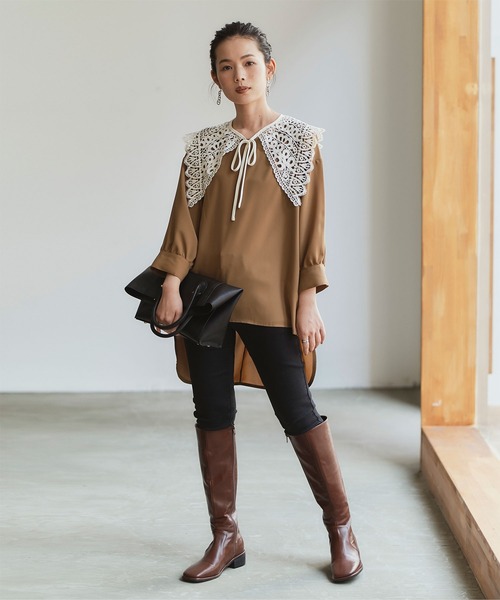 トレンドの付け襟がセットになった7分袖ブラウス。 ・程よいオーバーサイズシルエットで抜け感を演出し、体型カバーを叶えます。 ・レース素材の大きめ襟で華やかなアクセントをプラス。 ・取り外し可能なのでそれぞれ単品使いできるのもポイント。 ・大人女性らしいスタイリングに仕上げてくれる1枚。 ※当商品は機械による生産の過程上、どうしても"生地を織る際の糸の継ぎ目"や多少の"ほつれ"、他繊維の"混紡"、また、形やサイズや柄に多少の"誤差"が生じる場合がございます。 ※サイズは、実寸サイズを測っているため多少誤差がでる場合があります。製造工程の関係上、各採寸箇所実寸(平置き)より【約-3cm~+3cm】程度は誤差の許容範囲とさせて頂いておりますので、予めご了承くださいませ。 ※メーカーより密封状態で入庫し、検品時に再度袋詰めを行っておりますが、素材により染料等の臭いが強い場合がございます。 ※発送上の状態によって商品がシワになる場合がございます。 ※商品により色落ち・色移りがある場合がございますので、品質表示をご確認の上、お取り扱いにご注意くださいませ。 【生地】さらっとしたやや薄手生地 【伸縮性】なし 【透け感】淡色に多少あり 【裏地】なし