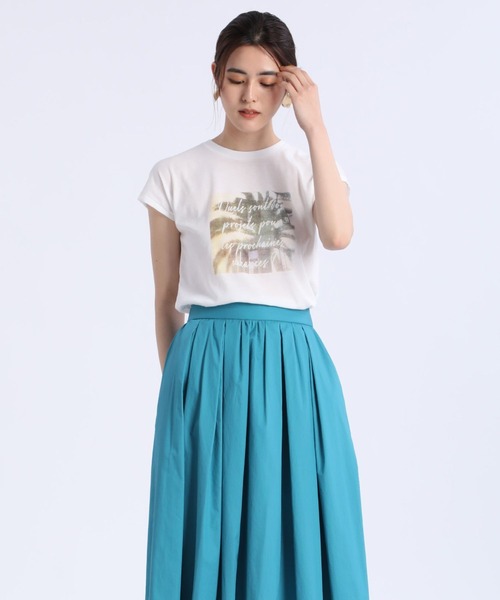シーズンライクなフォトにロゴを乗せ、アクセントを効かせたTシャツ。控え目に開けたクルーネックと華奢なスリーブで、カジュアルながらも大人の女性らしさをイメージさせます。一枚で雰囲気の出るTシャツはデニムパンツやワイドパンツと合わせ、夏らしいリラックス感のあるスタイリングがおすすめです。・水洗い可《マシュふわ(R)》マシュふわ(R)はソフトな風合いが特徴の、まるでマシュマロのようなふわふわとした優しい着心地の素材。特殊な加工を施すことで、お洗濯を繰り返してもソフトでふっくらとした質感を持続。着るほどに肌になじみ、長く愛用していただける逸品です。