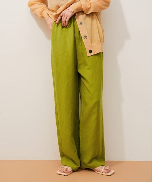 ◇2021春夏◇ADAM ET ROPE' FEMME【Material】リネンのさらっとした風合いとレーヨンのしなやかさを合せ持つレーヨン混リネン素材。しなやかな落ち感の中に程よいハリ感を持つ生地。程よい光沢で発色も良く、涼やかで夏に最適な素材。家庭でお洗濯可能。【Design】ストレートデザインのシルエット。ウエストはゴム仕様で楽に着用可能。またベルト裏にはアジャスト用の紐も通っており、履き位置を微調整できるのも嬉しいポイント。【Color】鮮やかで夏のポイ