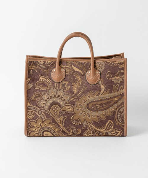 コーデのポイントになるビッグトートバッグ。 トレンドのジャガード生地を使用しました。 横長のフォルムで、内装に多数のポケットを配置し、A4がすっぽり収まる大きさでマチ幅もあり収納力も◎ デザイン性・機能性を兼ね備えた使い勝手の良いバッグです。 取り外し可能なショルダー付きで使い方の幅が広がります。 サイズ:縦:27cm 横:35cm マチ:14cm ショルダー長さ:94㎝から109cm(調節可能) 素材:【表地】ポリエステル:50% アクリル:50% 【裏地】ポリエステル:100% 【皮革部分】合成皮革 原産国:中国製