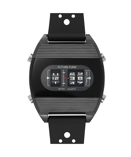1970年代に開発され多くの人々を虜にしたローラー式腕時計がベースのブランドはレトロだけど新しいドラム式デジタル 1970年代に開発され多くの人々を虜にしたローラー式腕時計が、現代の最新技術により画期的なアナログデジタルウォッチ『FUTURE FUNK(フューチャーファンク)』として現代に蘇りました。アナログデジタルウォッチとは、数字が印字したディスクを水平に回転させることによって文字盤のウインドーから時刻が見えるシステムをもった時計の事で、スイスの小さな工房がこのような時計をたくさん作っていました。そんな1970年代のレトロでユニークな時計を是非!! FUTURE FUNK 1970年代に流行したスペースエイジデザインで人気のローラーデジタルウォッチ『FUTURE FUNK』に当時のトレンドであった、ケースにガラスをはめ込んだトノーケースがラバーバンドで登場。当時は時刻表示部分がLED表示のものが多かったが、そこから立体的なローラー機構を覗かせることで、懐古的な雰囲気がより一層強くなりました。車のアナログ距離メーターのようにローラーを縦に回転させることによって時刻を表示することができる、クオーツ時計としては画期的なムーブメントを内蔵した腕時計です。 商品仕様 仕様:クォーツ 素材:ケース素材:ステンレススチール 風防素材:ミネラルガラス バンド素材:ラバー 防水:日常生活防水(3気圧) サイズ:ケースサイズ: 縦44.0mm 横42.0mm 厚み14.5mm ベルト幅22.0mm