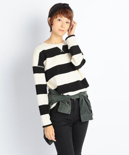 太めのボーダー柄がインパクトのあるプルオーバートップスです。わざと肩を落としたデザインが、毎日のコーデにほど良いリラックス感をプラスしてくれます♪ゆるシルエットながら着丈は短めにすることで、どんなボトムとも相性バッチリです!