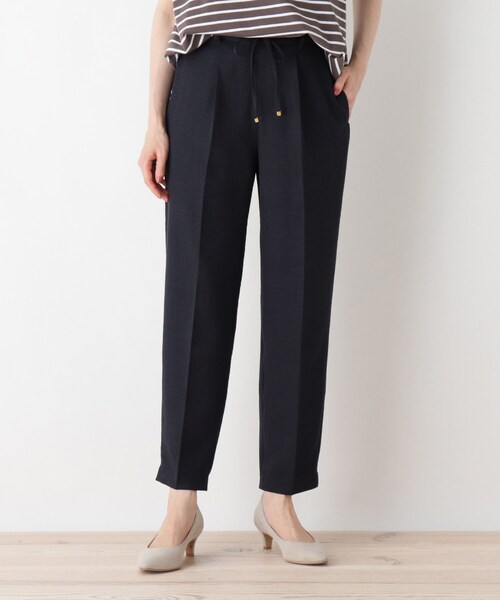 【デザイン】足首の見えるアンクル丈とセンタープレス加工ですっきりとした印象ののパンツです。ゆったりとしたシルエットとゴム仕様のウエストで楽ちんキレイが叶います。きちんと感があるのに履き心地がいいのがポイントです。オフィスカジュアルスタイルなど通勤スタイルにもおすすめです。※ポケット数:横×2【生地感】麻調素材で涼し気な印象です。※裏地なしこちらの商品は主に夏に着用いただける商品です。モデル情報:身長163cm B81 W56 H82 着用サイズ:02(M)店舗へのお問い合わせ商品番号:741-63007●製品寸法:02(M):W~72cm H88cm 股下67cm 前股上28cm 渡り幅30cm 裾幅17cm03(L):W~80cm H90cm 股下67cm 前股上30cm 渡り幅32cm 裾幅17cm備考: