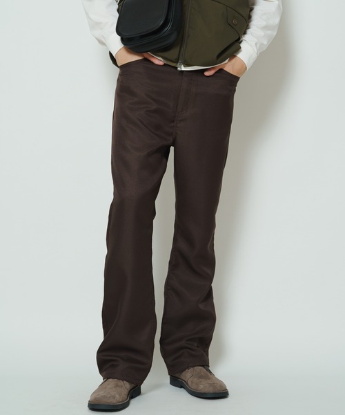 上品な印象で履ける今シーズンのマストアイテム・豊富なカラー展開・スタイルを美しく魅せるフレアシルエット・上品な光沢感のある素材【生地・デザイン】ワークウエアの伝統的なデザインの一つでもある5ポケットパンツをベースに、カラースラックスのような上品な印象の素材を用いたアイテム。やや裾にかけて広がる絶妙なフレアシルエットに。足長効果などスタイルを美しく魅せるだけでなく、ローファーやドレスシューズだけでなくボリュームスニーカーなども合わせやすく仕上げました。バックポケットや腰回りはコンパクトに、よりスッキリとしたデザインとなっています。昨今のトレンドもありながら、フレア加減を調整しており、まだフレアパンツを試したことがない方にもチャレンジしていただきやすいアイテムです。【コーディネート】TシャツやロンTなどシンプルなスタイリングにもアクセントになるカラー展開が魅力。また秋から冬にかけて暗くなりがちなコーディネートをぐっとオシャレにしてくれるトレンドのアイテム。スッキリとした印象のパンツなので、スウェットやロングコートなどビッグシルエットのアイテムとバランスよく合わせて頂けます。【HINSON/ヒンソン】1930年代にアメリカ合衆国アイオワ州ウォータールーに誕生したといわれる"HINSON"(ヒンソン)。当時のハンティングウェアにて独創的でありながら機能美を追求し、ハンティングを愉しむ富裕層を虜にしたブランドである。戦時中はジープの幌づくりなども手がけ、1940年代に入るとワークウェアやミリタリーウェアを手がけるようになると、ブランドの知名度も一躍高まり1940年代~1950年代に最盛期を迎えるも、1960年代にはブランドそのものが消滅したといわれる。 HINSONがユニークなのは文献資料がほぼ皆無である事。故にビンテージファンは実物をお手に入れる以外に、真実を知る術がない、そんな謎めいたブランドであり、今でもヴィンテージアイテムを好むファンを虜にするブランドである。【お買いものをよりお楽しみいただく為に!!】▼商品のお気に入り登録(ハートマークをクリック)お気に入りアイテムの完売カラーの再入荷通知や、ラスト1点の通知、セールの通知も受け取ることができます。▼ブランドのお気に入り登録新商品や再入荷など、クーポン配布などのお得な情報を受け取ることができます。