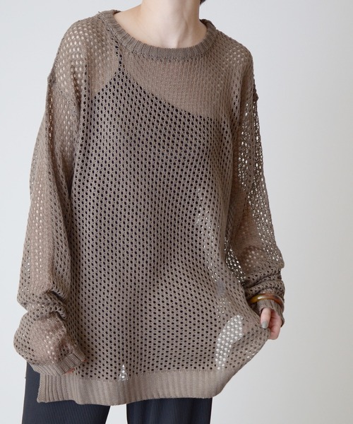 ざっくりとした網目でレイヤードをたのしめるメッシュニット。ビッグサイズのシルエットと、編地から見えるインナーや肌が今年っぽいしあがりに。キャミソールやタンクトプに合わせても、プリントTや、柄物のインナーと合わせるとアレンジ無限大。網目がほどよい大きさなので、チャレンジしやすい透け感です。■point・やわらかいさらさらニット。・程よい透け感・ヒップが隠れるチュニック丈・*******着丈 75バスト一周 104肩幅 52袖丈 68袖口 24裾一周 100*******透け感:あり厚さ:普通伸縮性:あり裏地:なし*******