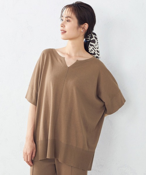 《素材》毛羽立ちが少なく、表面感が綺麗な素材です。 密に編み上げられたリブは伸縮性に優れ、 透け感を気にせず着て頂けます。 柔らかな肌触りとさらっとした素材感で 暑い時期で心地良く着て頂けます。 《デザイン》 首もとを綺麗に見せてくれるキーネックデザインです。 ゆったりとしたシルエットですが 中心に入ったタックによりすっきりと見えます。 二の腕が隠れる袖丈は腕回りをカバーします。 リラックス感がありながらも 目の詰まった上品な編みが 大人っぽくお洒落な印象に仕上げます。 ※12-52PW01との合わせはワンマイルウェアにもぴったり! 《セットアップ》 同素材のパンツ (商品番号:12-52PW01)と合わせて、 セットアップとしてお召しいただけます。 ※在庫がない場合もございますので、予めご了承くださいませ。 ※画像の商品はサンプルとなりますので実際の商品と仕様、加工、サイズが若干異なる場合がございます。 ※こちらの商品はFIVE FOXes独自の採寸方法となっています。 本サイトのサイズガイドと採寸方法が異なる場合がありますのでご了承ください。