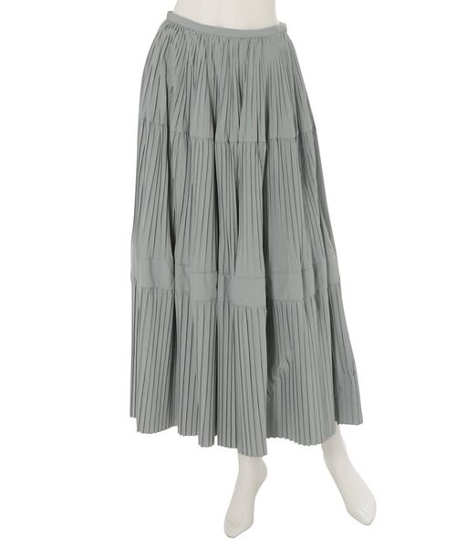 撥水加工が施されたハリ感のある素材を使用した贅沢なプリーツスカート。素材がモードで大人っぽい印象を与えつつ、細やかなプリーツのティアードデザインが繊細さを表現し、大人フェミニンなスタイリングを完成させます。フレアがたっぷり贅沢に入っているので動くと華やかな印象に。クリアな淡いカラー展開が凛とした女性らしさを引き立てます。 ▼スタイリング ブラウスで爽やかなスタイリングや、ニット合わせでエレガンスな雰囲気にもなります。ジャケットを羽織ればさらに大人っぽく、オフィシャルシーンにもマッチします。スニーカーからヒールまで、足元を変えてコーディネートを楽しめる一枚。 ※裾幅はサンプルよりも削っています。