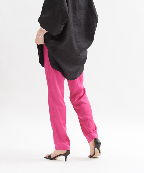 *POINT*サテンの光沢感とヴィヴィットなカラーで、コーデにエッジをプラス!いつものコーデをぐっと新鮮に見せてくれるトレンドパンツ♪*DESIGN*さらっとした軽やかなサテン素材で肌離れし、夏でも快適に穿いていただけます。裾に向かってスッキリと見えるテーパードシルエットは、楽な穿き心地なのに細見え&脚長効果を叶えてくれます。後ろウエストはゴム仕様でイージーデザイン。ゴムにステッチを打つことで、着脱時のゴムの捻じれ防止対策を施しています。*COORDINATE*Tシャツなどのカジュアルなトップスや、フェミニンなデザインブラウスなど、着こなしにエッジをプラスしたい時に合わせて頂くとアクセントになってくれます◎女性らしく穿きたい時は、足元に華奢なヒールサンダルを合わせるのがおすすめ。※ブラックのみ40サイズ展開がございます。ポリエステル100%のさらっとした軽やかなサテン素材。控えめな光沢感や発色の良いヴィヴィットなカラーがポイントです。洗濯:手洗い可