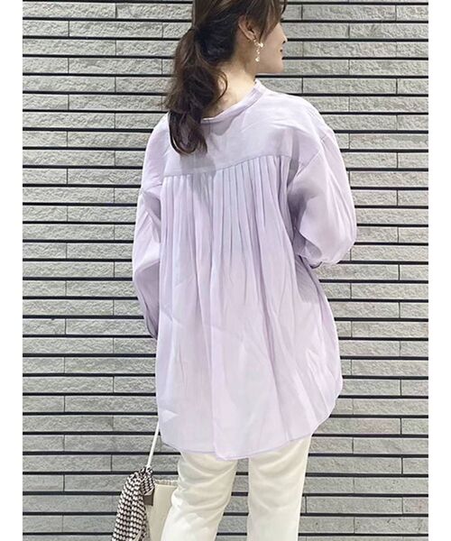 シアー感と、張りすぎず程よい落ち感のある合繊を使用したシャツブラウス。 着心地のいいサラッとした清涼感が、 爽やかで凛とした女性らしさを演出します。 後ろ身頃にタックを贅沢に施した バックシャンデザインが柔らかい動きを与え、 スキッパー襟と大きめのカフスが大人っぽく、 カジュアルときれいめを兼ね備えた雰囲気に仕上げました。 オフィスシーンにもお出かけにも、 シンプルなアイテムを合わせるだけでこなれ感が出るような一枚です。 ▼スタイリング テーパードパンツやフレアパンツなど、 シルエットにメリハリが効くアイテムとのスタイリングがお勧めです。 タイトスカートやざばっとしたスカートには、 フロントだけウエストインしてバランスのいい見せ方も◎ 休日には足元をスニーカーやフラットサンダルなどで外して、 大人カジュアルにも着こなせます。※カラー名に関しまして※【ライトブルー】が別販売サイトにて【アイスブルー】と表記されております。どちらも実際の色味は同じですのでご安心してお買い求めくださいませ。