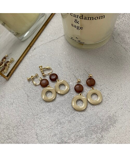 歩くたび揺れるモチーフ2連ピアス・イヤリングです♪ ブラウンとアイボリーの異なる質感と色味のコントラストが楽しめるアイテム。 表はアイボリー、バック部分はゴールドと動くたびに違った印象になり視線を惹きつけます★ ピアス、イヤリング2種類をご用意致しました。 夏らしくも秋らしくもお使いいただける一押しアイテムです。