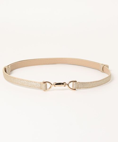 2021 秋アイテム ゴールドのリュクスなビットがコーディネイトのアクセントに。重ね合わせた2本の帯でサイズ調節も簡単なベルトです。カチッと留めるだけのビットもポイント。細めの帯でパンツはもちろん、シャツやワンピースのベルトマークにもおすすめです。合わせやすいベーシックなカラーや華やかなラメなどのバリエーションが揃っています。・合成皮革