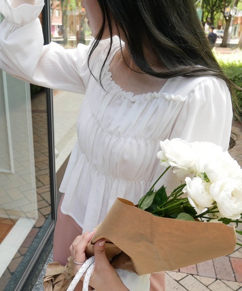 Bab×KANAMI___Shirring Blouse全体的に施されたシャーリングが女性らしいブラウス。 程よく透け感があって夏でも着やすいアイテムです。襟元はスクエアネックで、デコルテを綺麗に見せてくれます。 アウトしても野暮ったくならない丈感でスタイル良く着こなして頂けます。バックの襟元には、実はリボンが2つ施されていているのがポイント!夏に着たいアイボリー・ピンク、大人な印象になるブラックの3色展開でご用意。あえてデニムに合わせてカジュアルダウンしたり、スラックスやタイトスカートと合わせると綺麗めな印象に仕上がります。デイリーに使える着回し抜群のアイテムになっております。…………………透け感:なし(明るい色は透ける場合がございます)裏地:なし…………………Bab×KANAMI ---“ play in simplicity ”---“シンプルに使えるけど、遊び心を入れた主役級のアイテム”Babのpressとして活動してきたKANAMIがこの度商品のデザインをしました! デザインやカラーはもちろん、身体のラインが綺麗に見えるよう、シルエット・細部にまでとことんこだわりました。<KANAMIより>自分の身体に自信がない私でも、 綺麗なシルエットに見えるような お洋服があったらいいなとずっと思っており、悩みを解消できるようなアイテム作りを考えました。私と同じような悩みを抱えている方はたくさんいると思います。なので、そんな方にも安心して着て頂けると思います。 デイリーからちょっと特別な日まで、様々なシチュエーションでご着用頂けるアイテムばかりです!