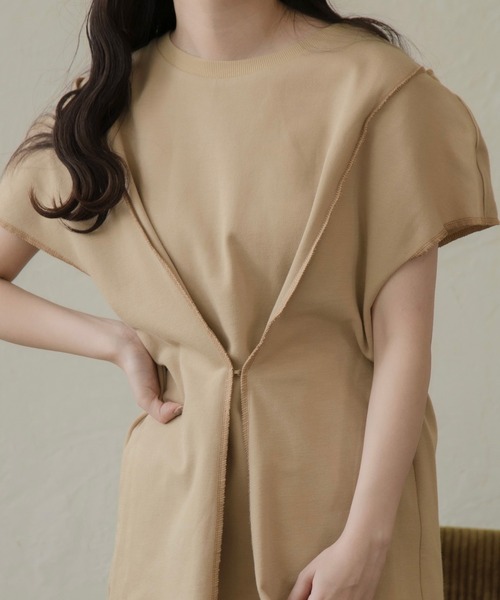 【オリジナルウエストホックct】 シルエットや配色のステッチがポイントで細部に拘った1枚です。ウエストのホックをとめて、スッキリとしたシルエットでもお召しいただけ雰囲気を変えて使える2way仕様となっております。程よい丈感なので、アウトスタイルもバランスよく見せてくれ、柄パンツや透け感のあるパンツと合わせていただくのもおすすめです。 センターのステッチラインとフレンチスリーブで細見えし、綿100%なのでサラッとお召しいただけるトップスです。 ※公式オンラインストアでお求めの際は、商品カラー名が異なりますのでご注意ください。 ベージュ→Beige × Beige ベージュ系その他→Beige × Brown
