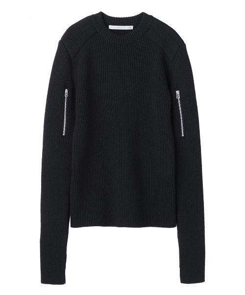 縦長シルエットのリブ編みのクルーネックセーター。腕部分にはポケットを付け、肩にはウレタンパッドを入れ力強いシルエットを作った。