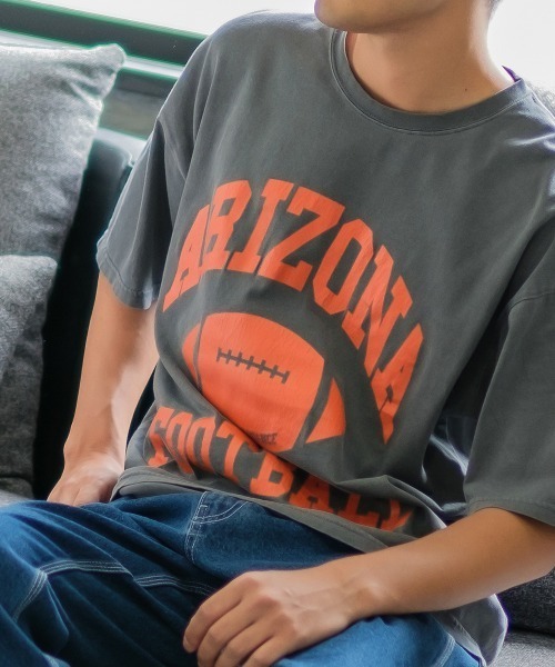 ピグメント加工によって使い始めから古着感を楽しめる味わい深い雰囲気の半袖Tシャツ。 洗いざらしによるガシガシとした触感もクセになり、また、着用し続けることで、さらなるエイジングを楽しむことができるのも魅力のひとつ。 夏のトップスにちょうどいい、さらっとまとえる軽やかなウエイトに、素材はコットン100%で着心地だって抜群にいい! ボディと相性の良い、古き良きアメカジを想起させるフォントやカレッジロゴをのせたグラフィックが自然な雰囲気で馴染んでおり、[A~C]はひび割れたクラックプリント、[D~T]は通常のプリントで仕立て上げています。 リラックス感のある、ゆったりとしたサイジングも今っぽく、流行りのオーバーサイズの着こなしやビッグシルエットを意識するならワンサイズ・ツーサイズアップもお勧め。 男女問わずユニセックスにお使い頂けるので、彼氏彼女のカップルコーデやお友達とペアルック等、お揃いで着用してもきっと“映える”一枚。