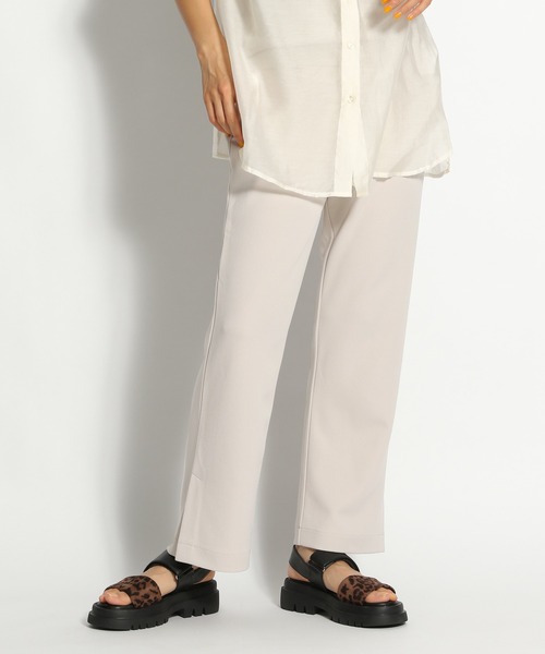 ラクチン&キレイ見えする便利な一枚名前の通りボトムをスラリときれいに見せてくれて、ON/OFF使えるカットソーパンツ。ウエストはトップスインやレイヤードにも使いやすいシンプルなデザインに、後ろゴム仕様でリラクシーな着心地に仕上げました。素材は程よくハリ感がり、表情のある織りが特徴のカルゼ素材を使用。裾のスリットがアクセントになり、今っぽい印象に。