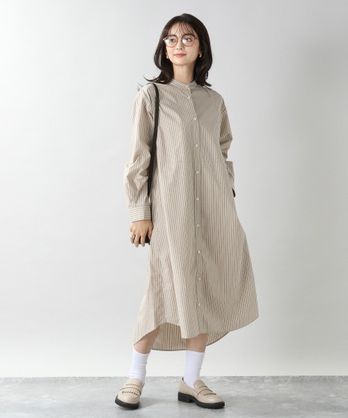 ーーー 爽やかな印象のストライプシャツワンピース。 バンドカラーになっているので顔回りをすっきりとした印象に見せてくれます。 ーーー 細身のストライプなので主張が少なく、柄物をあまり着ない方でも挑戦しやすいのがポイント。 前後で丈感を変えているので足回りを綺麗にみせてくれるデザインになっています。 ポケットがついているので機能性も◎ ワンピースとしても、羽織としても着用していただける着回しの効く優秀アイテムです!