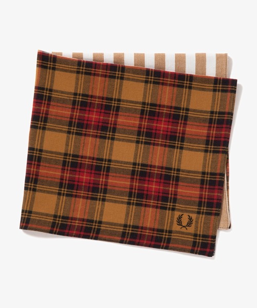 48×48㎝の先染めのハンカチーフ。糸の入り方を計算して織り上げることでオリジナルのストライプやチェックといった柄を一枚の中で4柄表現しています。タータンはウェアと連動したデザイン。折りたたみ方を変えれば気分やオケージョンに合わせた柄でご使用いただけます。国産。 FRED PERRY(フレッドペリー) 1952年にテニスウェアブランドとして設立。ユニークなスポーツウェアのバックグラウンドと、ミュージック・ヘリテージを持ったグローバル・ファッションブランドへとさらなる進化を遂げています。