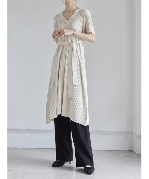 すっきりとしたVネックで抜け感のあるsrib knit one piece なめらかな落ち感の薄手のリブニット素材で、 上品な大人シルエットに。 カジュアルにもきれいめにも、 合わせるアイテム次第でいろいろな表情をお楽しみ頂けます。
