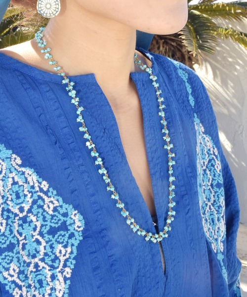 爽やかなカラーでコーデのワンポイントになるネックレス。ターコイズブルーは、その空色を想わせる色彩のようにとても明るいエネルギーを持ち、困難を乗り越え願望を達成するための助けになるといわれています。 勇気と行動力をもたらし、大切な一歩を踏み出す力をきっと貸してくれることでしょう。 ※こちらの商品は1点1点職人による手作りとなります。その為、形や色合いなど若干異なる場合がございます。あらかじめご了承ください。 ※屋外での撮影画像は、光の当たり具合で色味・カラーが違って見える場合がございます。商品のカラーは、スタジオ撮影の画像をご参照ください。 Amina Collection Co.,LTD.