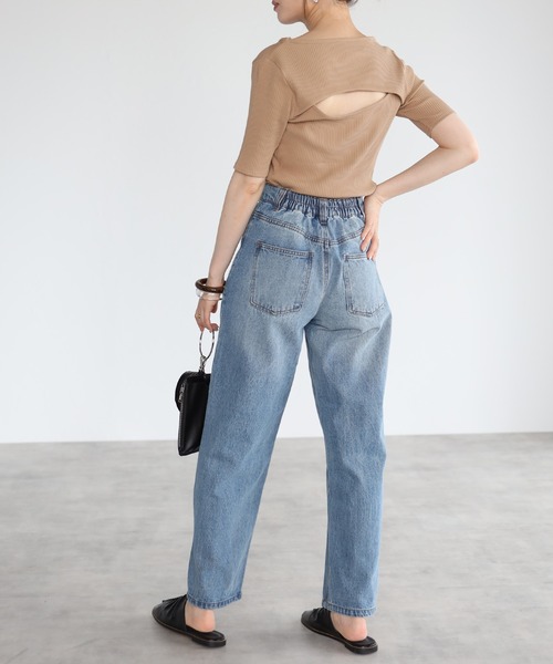 着回しの効くテレコ素材のバックオープンTシャツ 《STYLING》 一枚でデニムと合わせたシンプルなコーディネートも良し、 キャミワンピ等のインナー使いとしても良し コーディネートの幅が広がる一枚です。 《DETAIL》 後ろのオープンデザインがポイントになる1枚。 テレコ素材が女性らしいフェミニンな印象を与えてくれます。