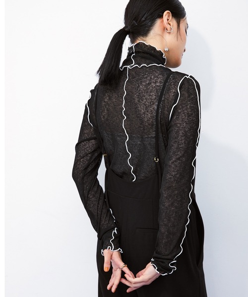 一枚でも、レイヤードアイテムとしても。着るだけで一気に旬見えコーディネートに格上げしてくれる、配色メローと透け感が魅力のタートルプルオーバー◆2021-22秋冬◆ADAM ET ROPE' FEMME【Material】シアー感のあるスラブジャージーテレコ素材を使用。ドライタッチな肌触りが特徴。【Design】配色のメローフリルと透け感が魅力のテレコタートルプルオーバー。着るだけで主役級の華やかさがある素敵な一着。伸縮性があり着心地も良く、脱ぎ着が楽なのも嬉しいポイント。【Color】ブラック、ライトグレージュ、オフホワイトの3色展開。【Styling point】暑い時期には、中にインナーを着て透け感を楽しむ華やかな一枚着として、季節が進んで涼しくなってきたら、ニットなどと組み合わせてレイヤードを楽しむのがおすすめ。クルーネックやVネックとの合わせだけでなく、タートル×タートルのレイヤードもぜひ。---------------裏地:なし光沢感:なし透け感:あり伸縮性:あり生地の厚さ:薄手洗濯方法:手洗い可---------------※画像の商品はサンプルです。お届けする商品に仕様・サイズ等の変更が生じる場合がございます。予めご了承ください。※ロケ撮影画像は、光の当たり具合で色味が異なって見える場合がございます。商品の色味は、スタジオ撮影の画像をご参照ください。