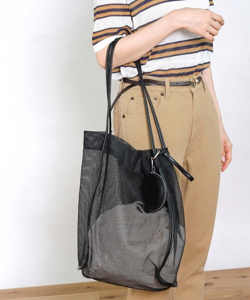 涼し気なメッシュ素材がトレンドライクなトートバッグ。透け感のあるデザインがこなれた印象にしてくれます。ミニサイズのポーチ付きで小物の収納ができるのも嬉しいポイント◎取り外せる巾着付きなので中が見えることなくお使い頂けます。※ サイズは商品を平置きしての採寸です。商品によっては若干の誤差が生じる場合もございますので、予めご了承くださいませ。※ 当商品は工場での生産の過程上、どうしても糸始末のほころびや多少のほつれほか、繊維の混紡、生地のしわまた、形やサイズに多少の誤差が生じる場合がございます。 ※ 撮影時の照明などの環境と、モニターに表示される色味がメーカーにより変わってしまう等の理由により、実際にお届けする商品と、ご覧になられているアイテムの色が若干異なる場合がございます。ご了承下さいませ。