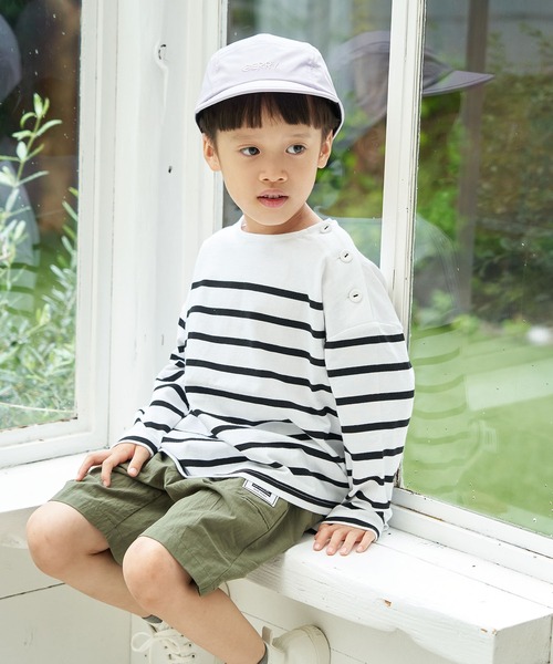 エターナルなボーダートップスならキッズの毎日に大活躍!【素材感】 ・着心地の良いコットンを使用し、さらりとした生地感を実現。 【デザイン・シルエット】 ・左肩のボタンディテールが印象的なボーダー柄ボートネックカットソー。 ・ママとお揃いで着られる人気の親子リンクシリーズ。 【カラー】 ブラック(01):ホワイトベースにブラックのボーダー ベージュ(27):ベージュベースにホワイトのボーダー パープル(50):ホワイトベースにパープルのボーダー 【スタイリングポイント】 ・ワイドパンツに合わせて爽やかなマリンルックが完成。 ・チノパンツやジーンズなどのカジュアルボトムと好相性。 ・同シリーズで大人(品番:GDM51370)も展開しているので親子お揃いもおすすめ(大人は肩ボタンついていません)。 ----------------------------- 裏地:なし 透け感:ややあり 伸縮性:ややあり 生地感・厚さ:やや薄手 季節:春・秋 ----------------------------- ※撮影時の光、お使いのモニター環境によって色の見え方が違う場合がございます。 ※girl’smodel:身長121cm 着用サイズ:120 ※boy'smodel:身長:107cm 着用サイズ:120