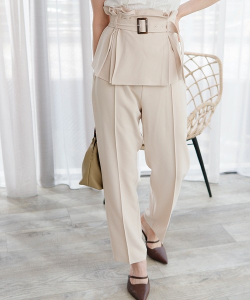 ふんわりと重ねたペプラムデザインがフェミニンなテーパードパンツ。取り外しが出来るので、シンプルにも使える2WAY仕様。センターラインのピンタックも、シルエットをスマートな印象にまとめてくれます。デイリーにはもちろん、デートや女子会などのお呼ばれスタイルにも活躍してくれるアイテムです。
