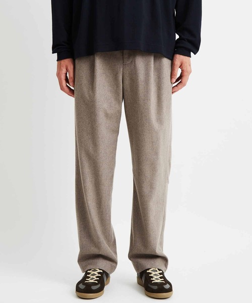 《カシミアのような極上な肌触りとガシガシ使える丈夫さを兼ね備えた1本》 上品さも程良いカジュアルさも堪能できるリラックスイージーパンツ。【素材】 「カシミア素材のような極上の肌触りは毎日着たくなるほど病みつきに。カシミアのデメリットである耐久性も払拭した文句なしの素材感」 『shmere シュミア』と名付けた新しいファブリックレーベルです。カシミヤタッチの風合いと杢調のエコフレンドリーな色合いが特徴です。スーパーエクストラファインメリノ(16.5-17.5μ)に属する部類で、カシミヤ (13~16μ)に非常に近い繊維長で細やかな肌触りですが、カシミヤ特有の毛玉になりやすかったり、耐久性が弱くてデリケートに扱わなくてはいけないデメリット解消した素材です。生地の仕上げはストレッチフラノにしていて、中肉の使いやすい素材感なので、秋~冬に掛けて長く着用していただけます。今回の為にしつらえた織ネームは『shmere』の世界観表現する為に、麻混にする事でムラ感を出してデザインに馴染むようにしています。 ※マイクロン(μで表記)とは、繊維の太さを示していて、一般的には数値が少ないほど繊維が細くて肌触り良い上質なウールとされてます。 【デザイン・シルエット】 「ワイド過ぎない絶妙なリラックスシルエットで合わせるトップスを選ばない汎用性。上品さも程良いカジュアルさも堪能できる1本」 ウエスト、ゴム+ヒモ仕様のリラックスイージーパンツです。フロントに1プリーツ入っているので、ヒップからワタリもゆったりとしてストレスフリーな着用感です。ヒモは麻混を採用しており、スラブ感が表地の雰囲気とマッチ。カジュアルになり過ぎず、上品な印象にまとまっています。太過ぎないシルエットなので、アウターやトップスを選ばずコーディネートが決まりやすいです。ウーステッド素材ですが、カジュアルにも合わせやすいよう製品洗いを施し、単に上品なだけでなく、程良く粗野な印象も楽しんで頂ける1本です。 【カラー】 色はアイボリーに近いグレージュと、柔らかい印象のネイビー2色展開。トレンドのジェンダー・ニュートラルな要素として、アダムエロぺらしい杢調の優しい色目で時代性を表現しています。 【おすすめスタイリング】 シャツやカットソーなどベーシックなトップスに単品で合わせるのはもちろん、同素材で揃えたブルゾンやシャツとのセットアップもオススメ。今年は無染色ニットやエコフレンドリーな色合いのアイテムとの組み合わせが新鮮です。 ※同シリーズ、同素材の型番 GMS11100 Shmereウールイージーパンツ GMG11100 Shmereバルカラーウールシャツ GML11100 Shmere TYPE1 ジャケット GMO11020 Shmereオーバーチェスターコート GMO11010 Shmereドロップショルダーダッフルコート 【推奨サイズ】 サイズS:身長~165cm サイズM:身長~175cm サイズL:身長176cm~ ※標準体型を基にした目安になります。 ----------------------------- 裏地:なし 光沢感:なし 透け感:なし ポケット:あり 伸縮性:ややあり 生地の厚さ:やや厚手 -----------------------------