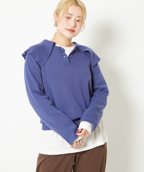 セーラーカラーでコーデにこなれ感をプラス。 ・今季注目のセーラーカラー ・チクチクしない生地 ・レイヤードスタイルも◎ 【生地・デザイン】セーラーカラーが新鮮なニットトップスが入荷。女性らしいセーラーカラーが目を引くアイテム。秋冬定番アイテムに新鮮さをプラスした1着。ニット特有のチクチク感もなく、着心地の良い生地です。厚手過ぎないので重たさが無いのも嬉しいポイント。レイヤードスタイルもしやすく、コーデの幅も広がります。首元はボタンデザインになっているので、開けて着ていただいても◎ベーシックに使えるアイボリー・ブラウン、パキっとカラーでコーデのアクセントにぴったりのブルーの3色展開。 【コーディネート】 女性らしいデザインなので、あえてデニムで合わせてカジュアルダウン。カジュアルながらも女性らしさもしっかり見えるコーデに仕上がります。淡いカラーでメリハリをつけると、より今年っぽいカラー配色に。 厚手過ぎない生地なので、Tシャツとのレイヤードスタイルも新鮮でおすすめ。ボタンを開けると、抜け感が出て更に◎ 【お買いものをよりお楽しみいただく為に!!】 ▼商品のお気に入り登録(ハートマークをクリック) お気に入りアイテムの完売カラーの再入荷通知や、ラスト1点の通知、セールの通知も受け取ることができます。 ▼ブランドのお気に入り登録 新商品や再入荷など、クーポン配布などのお得な情報を受け取ることができます。