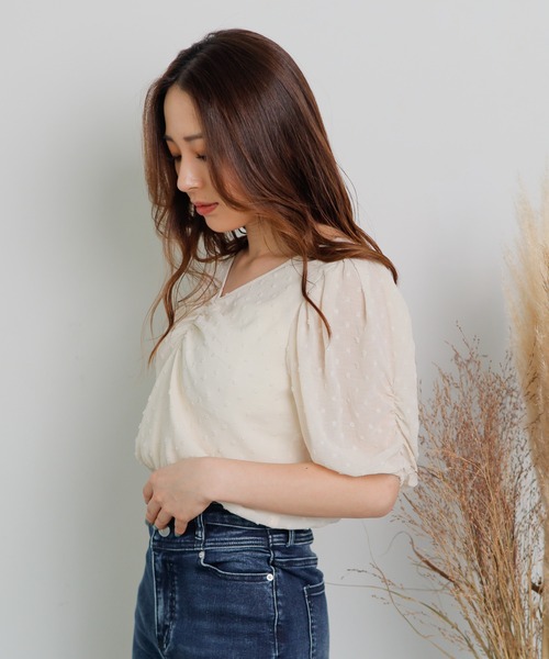小さめのドットプリントが上品な印象のトップス。 ギャザーをよせたボリュームのある袖や立体感のあるフロントデザインが、女性らしい印象を与えてくれます。細身のベルトがアクセントをプラスする、大胆なバックスタイルもポイント◎ 裾はシャーリング仕様でウエストをキュっと引き締め、ショート丈が脚長効果もさりげなくアシストしてくれます。