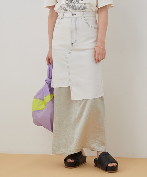 《セットアイテム・単品使い可》着るだけで新鮮なレイヤードスタイルが完成。サテン×デニムで大人のカジュアルコーデを楽しめるスカート◇2021春夏◇ADAM ET ROPE' FEMME 【Material】サテン:ビンテージのワッシャー加工が入ったサテン素材を使用。デニム:伸縮性のあるストレッチの効いたデニムを使用。【Design】サテンのツヤ感のあるロングスカートと、カットオフしたデニムスカートを合わせたセットアイテム。それぞれ単品でも使用できるのも魅力。【Color】黒デニムに黒サテン、白デニムに白サテンの2色展開。【Styling point】 カジュアルでモードな印象のデザインスカートなので、トップスには、シンプルなTシャツやシャツなどを合わせるのがおすすめ。---------------裏地:なし(サテン)、なし(デニム)光沢感:あり(サテン)、なし(デニム)透け感:なし (サテン)、なし(デニム)ウエスト:ゴム(サテン)、ゴムなし(デニム)ポケット:なし(サテン)、あり(デニム)伸縮性:なし(サテン)、あり(デニム)生地の厚さ:薄手(サテン)、やや厚手(デニム)洗濯方法:弱水流での洗濯可ボタン:なし(サテン)、あり(デニム)---------------