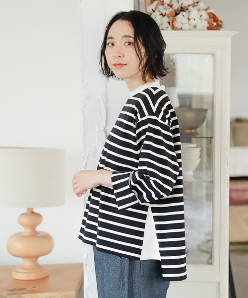 ーーー 裾に向かって広がったテントシルエットのカットソープルオーバー。 ボーダーの柄を袖口の切り替え部分で変化をつけ、いつものボーダーアイテムにワンポイント加えたアイテム。 テントシルエットは全体に動きが出て立体的になり、お腹周りのシルエットもカバーしてくれます。 ーーー デニムパンツはもちろん、シンプルなパンツとのコーディネートでも◎